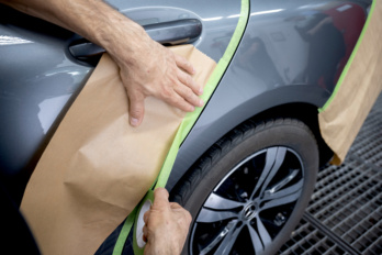 Papier nach Ermessen zuschneiden und an den zu schützenden Teilen mittels Abdeckklebeband befestigen.Achten Sie darauf, dass das Papier mit der beschichteten Seite nach oben angebracht wird. Um ein Durchschlagen von Klarlacken auszuschließen, das Papier an der Lackierkante doppelt legen oder ein schmales Papier (22 cm) vorlegen.
