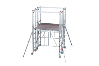 For connecting two folding roller scaffolds for use as area-wide scaffolding