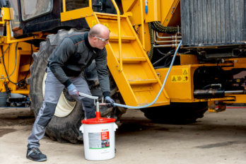 - Schmiergerät mit dem Füllnippel auf den Füllstutzen des Füllgerätes drücken. Der Füllstutzen besitzt